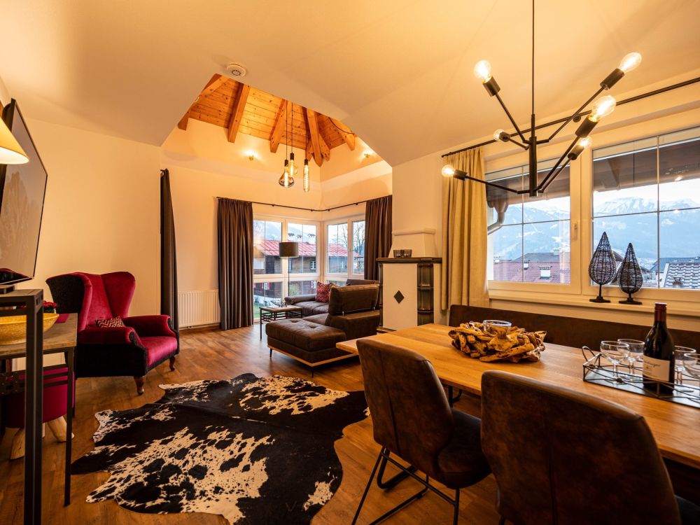 - Einzigartiger Panoramablick - Wohnraum mit offener, voll ausgestatteter Küche und Esstisch und beheiztem Kachelofen