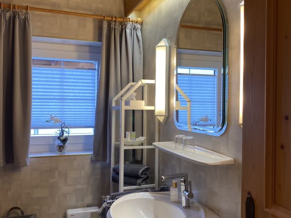 - Badezimmer mit Dusche, WC und Bidet, Kosmetikartikel, Haarföhn